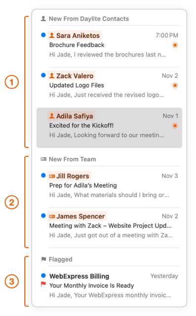 Cut through email clutter so you can focus on the messages that move your business forward. Priority Inbox surfaces emails linked to your clients, prospects, and team, automatically grouping them into three smart groupings: Contacts in Daylite (1), Daylite Users (2), and Flagged Emails (3). This helps you focus on the conversations that matter most, act faster, and stay on top of what moves your business forward.